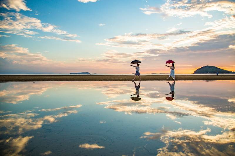 位于香川县三丰市,约1km左右的海滨浴场「父母之浜」。被誉为日本的乌尤尼盐沼、傍晚之际可以欣赏到令人动心的绝景。乌尤尼盐沼是南美的玻利维亚的盐沼,因降雨汇集而成,将天空美景倒映在湖水中,呈现出壮丽的“天空之镜”。作为有生之年必看的世界绝境而闻名于世,此“天空之镜”在父母之浜也可以欣赏到。